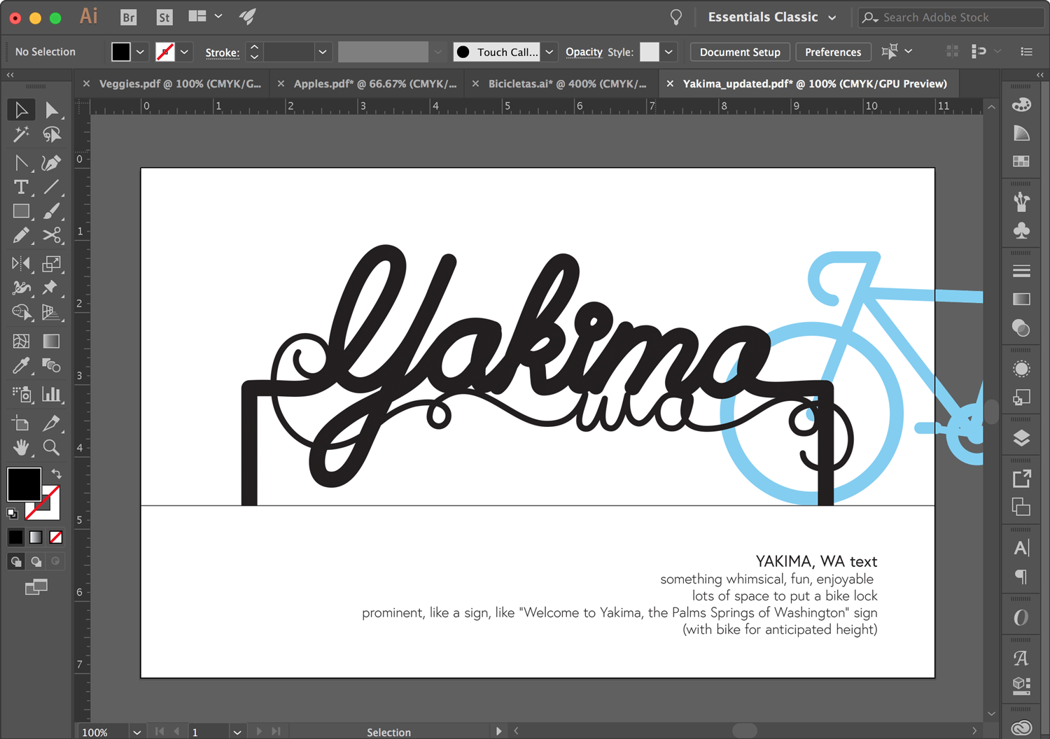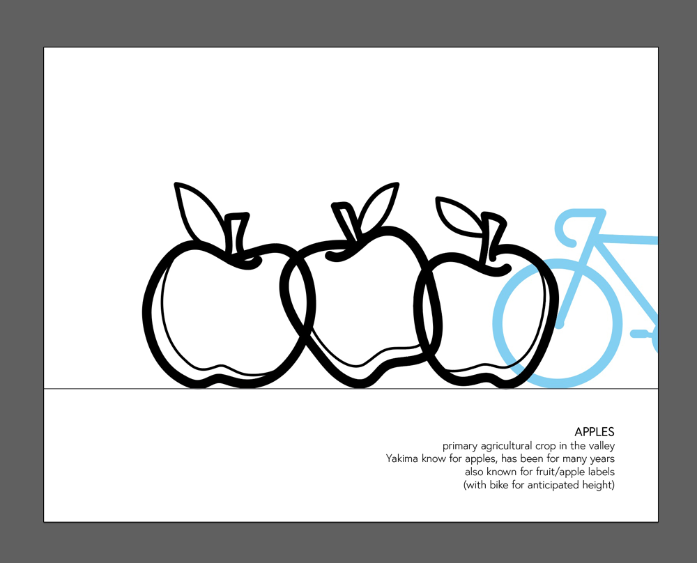 This project included designing new bike racks for downtown Yakima based on ideas from local residents. Translating the ideas into vector format with my own illustration style, the most popular designs altered for durability and fabricated into powder coated metal pieces installed in multiple locations around the city. You can now lock your bike to a piece of art in Yakima!