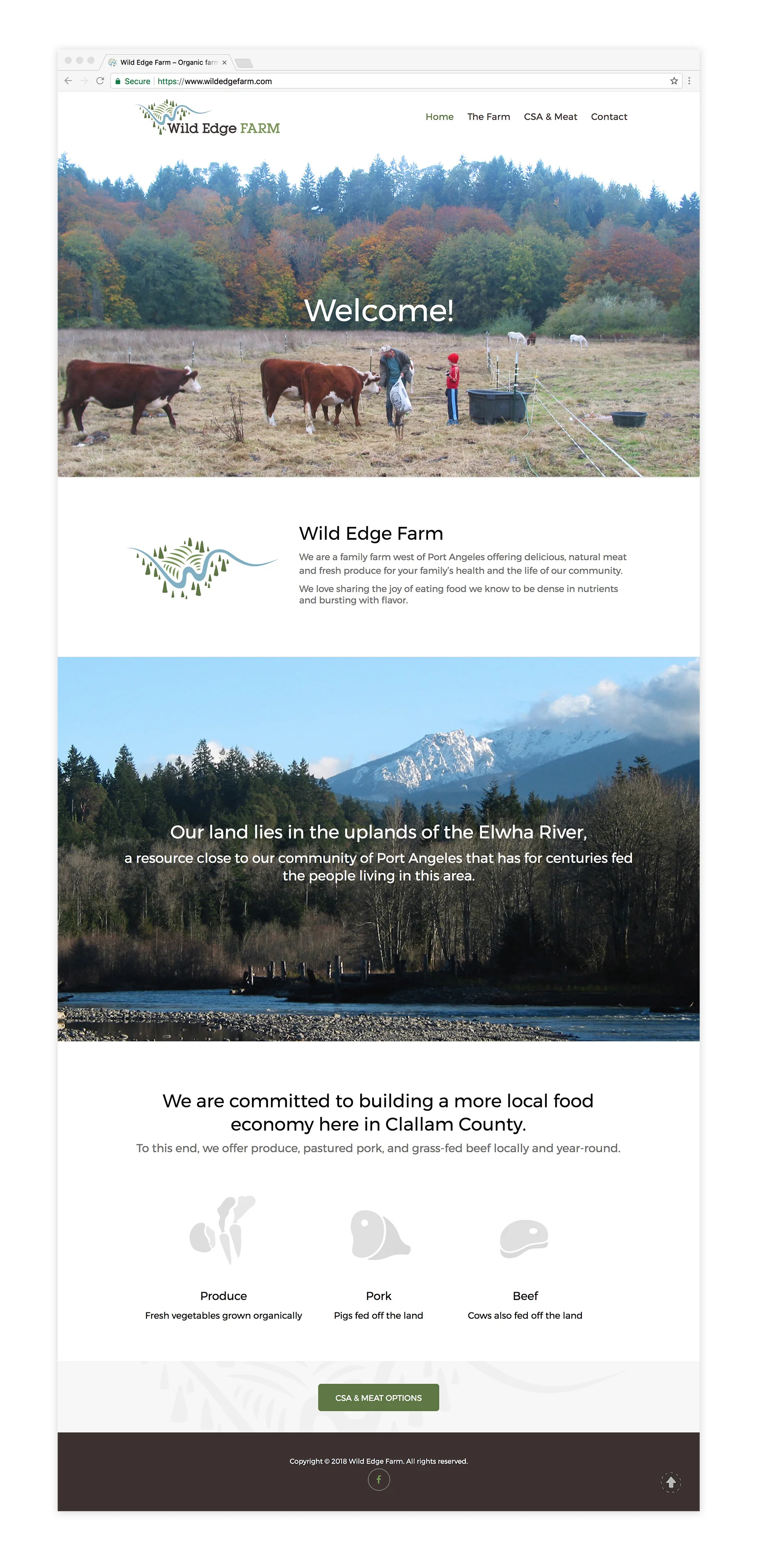 Logo, business cards, and website design for Wild Edge Farm, an organic farm located on the Olympic Peninsula in Washington State focusing on produce, pasture-raised pork and grass-fed beef.